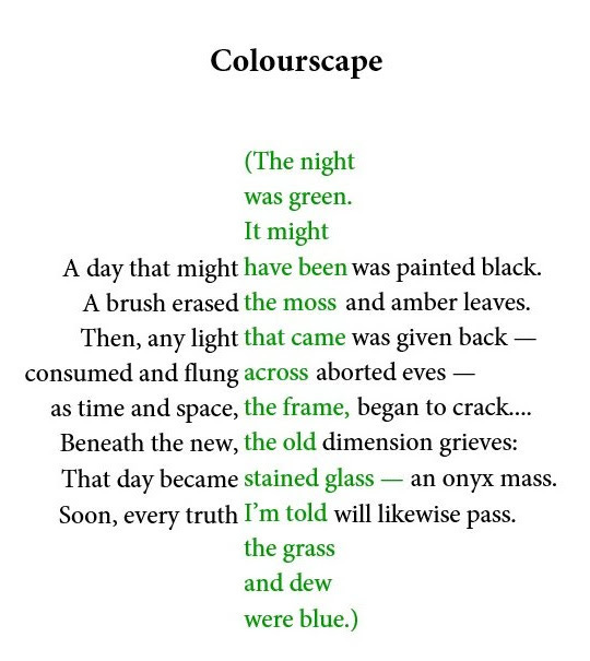 An aelinscape is a metered poem in which two or more formal poems share metrical feet. This form (or rather group of forms) first appeared in my collection SLATE PETALS.
