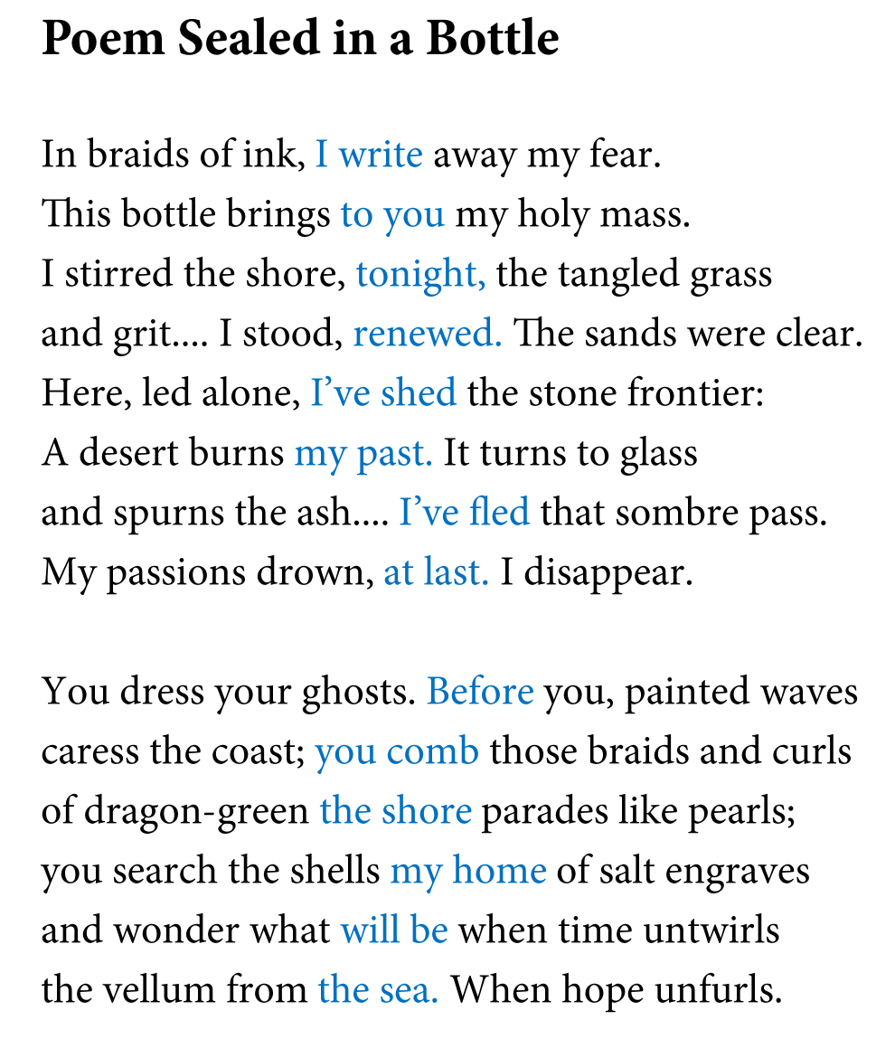 In this next aelinscape, a Petrarchan sonnet in iambic pentameter holds within it a Shakespearean sonnet in iambic monometer, such that the Shakespearean sonnet is made from the third feet of the Petrarchan sonnet’s lines.